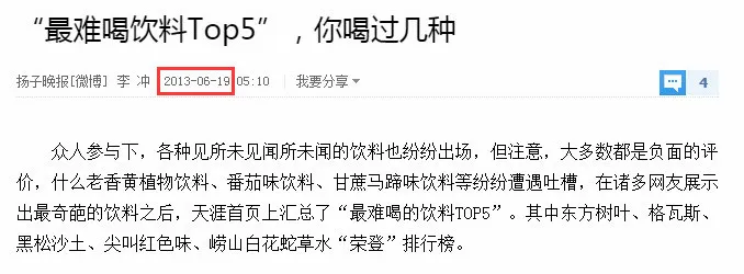 2013年,有用户在天涯社区上发起了一则有关“奇葩饮料”的讨论贴,这则帖子中,网友纷纷晒出了自己喝过的最奇葩的饮料,不仅如此,据悉当时的天涯首页上还就此汇总出了“最难喝饮料Top5”。[1]