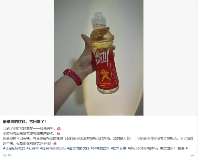 如今网友们对红瓶尖叫的评价似乎也出现了反转。在小红书上,有红瓶尖叫的十年甚至是二十年老粉出来冒泡,称“活了20几年,身边没有任何人像我一样爱喝这个味道!”,也有的人“黑转粉”,称小时候喝一口就吐了,这次喝到却感觉味道好像没有那么冲了。