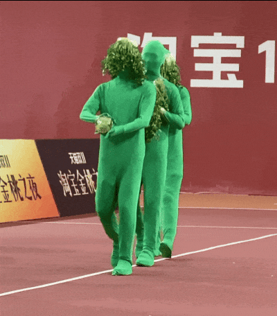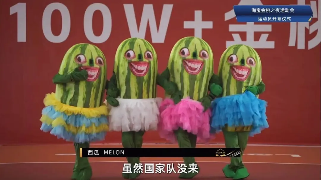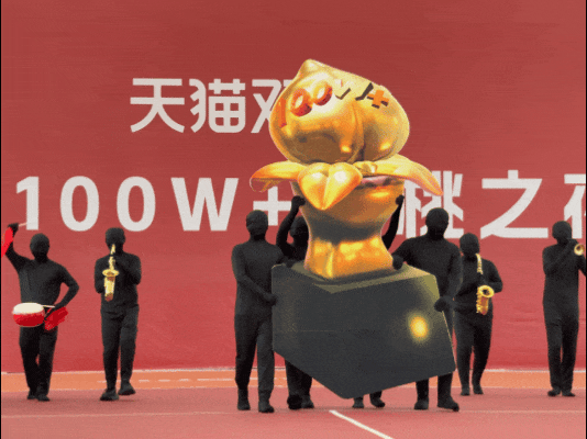 第一个出场的是护桃手方阵。他们一路护送着淘宝100W+金桃奖杯,向观众们走来。