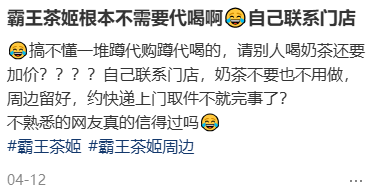 不过也不见得非要托人代喝,据网友分享,霸王茶姬对买椟还珠的配合度和熟练度与日俱增,可以直接跟门店沟通,下单套餐但不要奶茶只要周边,同时再约快递员到店取件,双线行动护周边护无虞,没有中间商赚差价。
