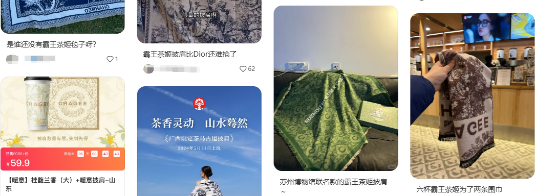 包五花八门,小杂货更是应有尽有。杯垫、香卡、手机壳,徽章、毛毯、冰箱贴,有水杯还有羽绒杯套。买奢侈品包要另外配的货,在霸王茶姬也和包一起出现了。