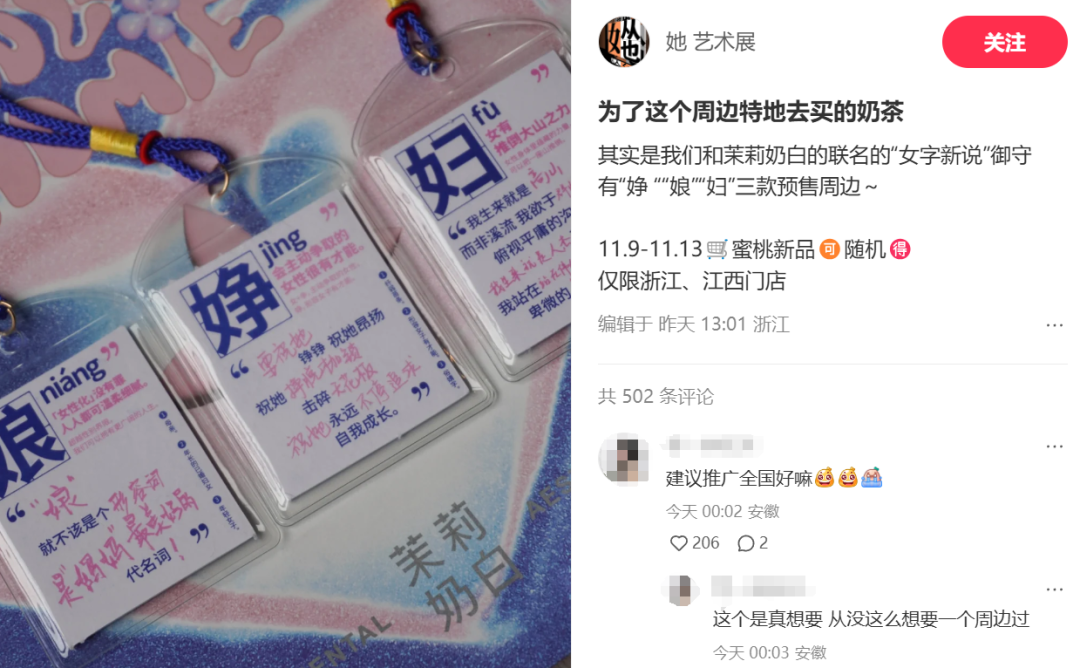 摩拳擦掌的轻乳茶新势力也这么玩,茉莉奶白新近推出和“她”艺术展的联名御守,总共就上架5天,还仅限浙江、江西门店,评论区一声“建议推广全国”,就是周边能获得的最大夸赞。