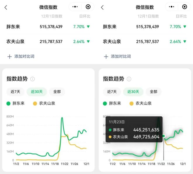 从微信指数可以看出,与同期也陷入危机的“胖东来”相比,农夫山泉仅在11月23日超越了胖东来,到达了脉冲式传播的“山顶”,这个节点就是钟睒睒炮轰张一鸣的第三天。