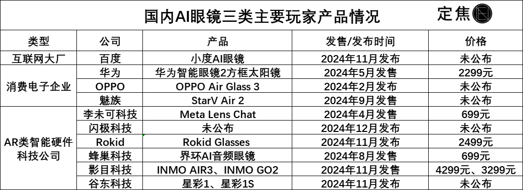据「定焦One」梳理,目前入局AI眼镜的公司可以分为三类,它们的产品及主要信息如下表: