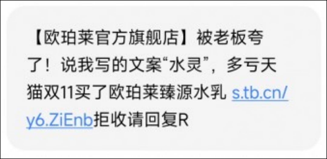 今年淘宝双十一商家的短信营销,也水灵灵地玩起了梗,用到了水灵灵的水乳品牌上。