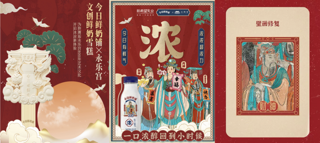 今日鲜奶铺作为永乐宫品牌合作伙伴,自2023年9月起,就与永乐宫诸天神仙们组成神仙CP,并多次与永乐宫开展合作,用一瓶小小的牛奶和各种营销活动,为中国传统文化助力,帮助永乐宫壁画走向更远、更大的世界舞台。