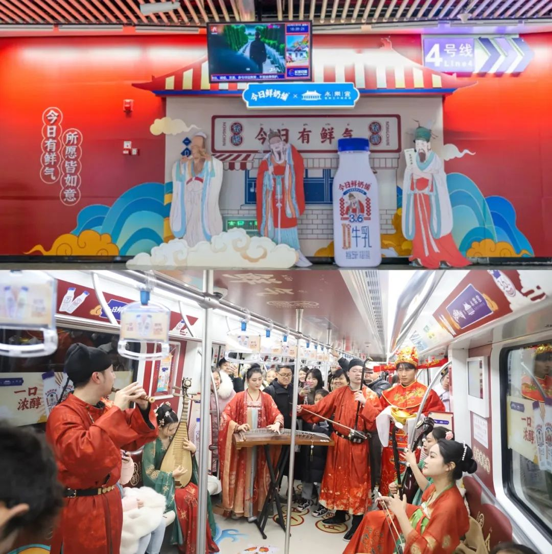 同样被众神眷顾的城市还有长沙,在长沙地铁五一广场站3A互动区,今日鲜奶铺打造了一整面动态永乐宫互动橱窗,喜气满满的“月神”在橱窗中为每一位过路的人们送上新年祝福。在6号线全景列车,不仅车内车外的装饰全部被永乐宫神仙承包,还有国风民乐乐队现场演绎国风音乐,为人们送上送上福气、才气、喜气、运气、朝气、财气的满满祝福。动态体验、音乐鉴赏、地铁内装……在今日鲜奶铺的帮助下,永乐宫元素成了长沙地铁的“新皮肤”,让每一个赶路的居民和游客,都从中领会到永乐宫壁画的精美。