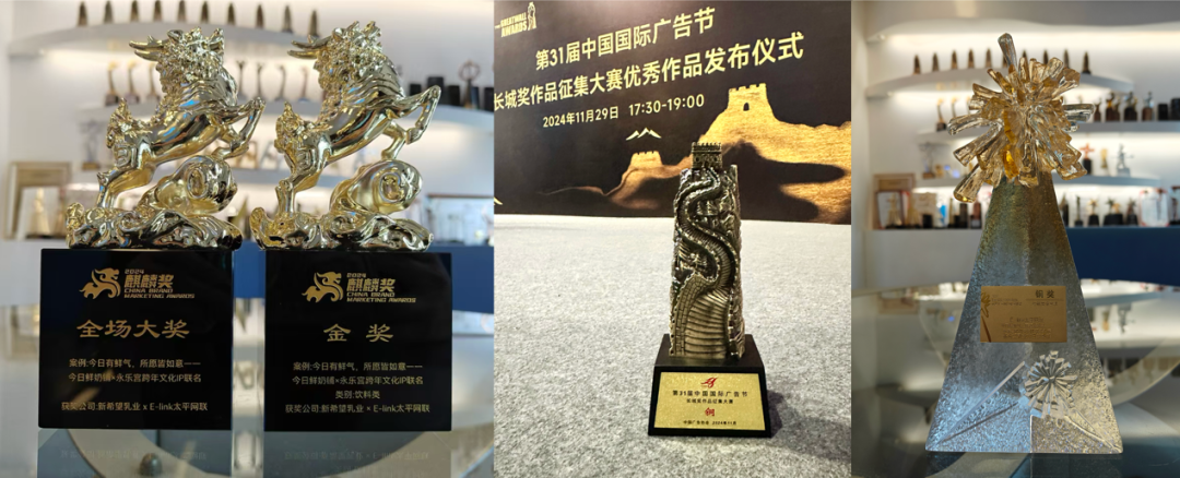 洞察精准、响应迅速、匠心独具……今日鲜奶铺品牌在营销领域上的出色表现,也收获了众多成就。其中,《今日有鲜气,所愿皆如意》今日鲜奶铺×永乐宫跨年文化IP联名荣获2024第八届麒麟国际创意节营销推广全场大奖和饮料类金奖;今日鲜奶铺×永乐宫跨年文化IP联名还荣获第15届虎啸奖联合营销类-优秀奖;今日有鲜气,所愿皆如意--今日鲜奶铺×永乐宫跨年文化 IP 联名行销荣获第 31届中国国际广告节长城奖作品征集大赛优秀作品铜奖。奖项的认可代表着品牌的不凡创意和实践,用户实打实的口碑和称赞则成为了品牌持续增长的“鲜”动力。