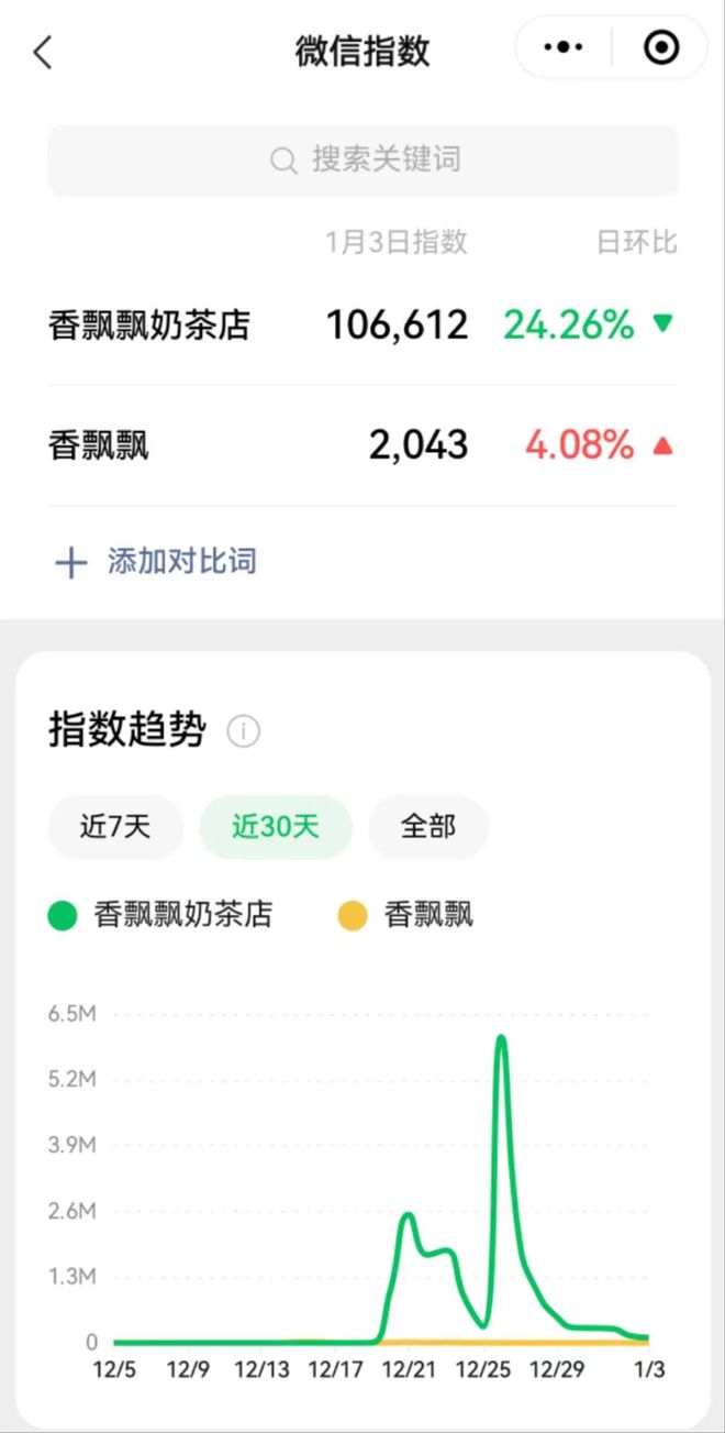 “香飘飘奶茶店”的微信指数,更是超了“香飘飘”这个品牌名5倍。可见,此事的热度之高。