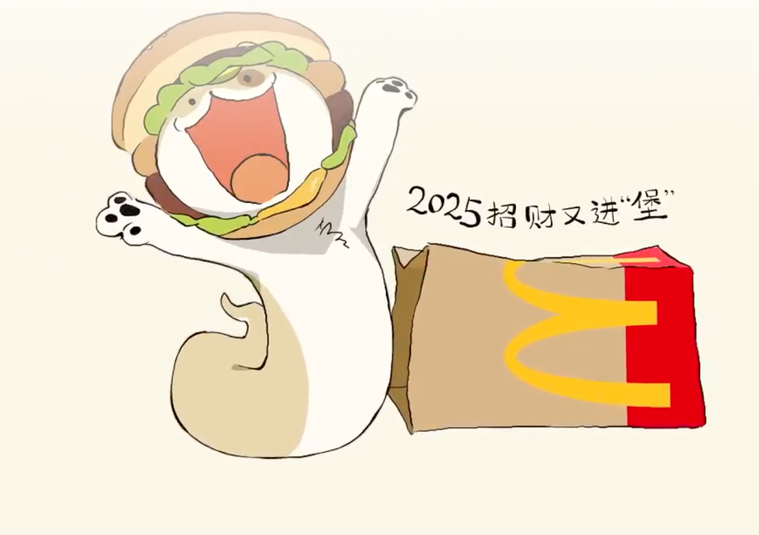 片中,点点与薯条、汉堡和品牌logo灯互动,用谐音梗为大家送上祝福。
