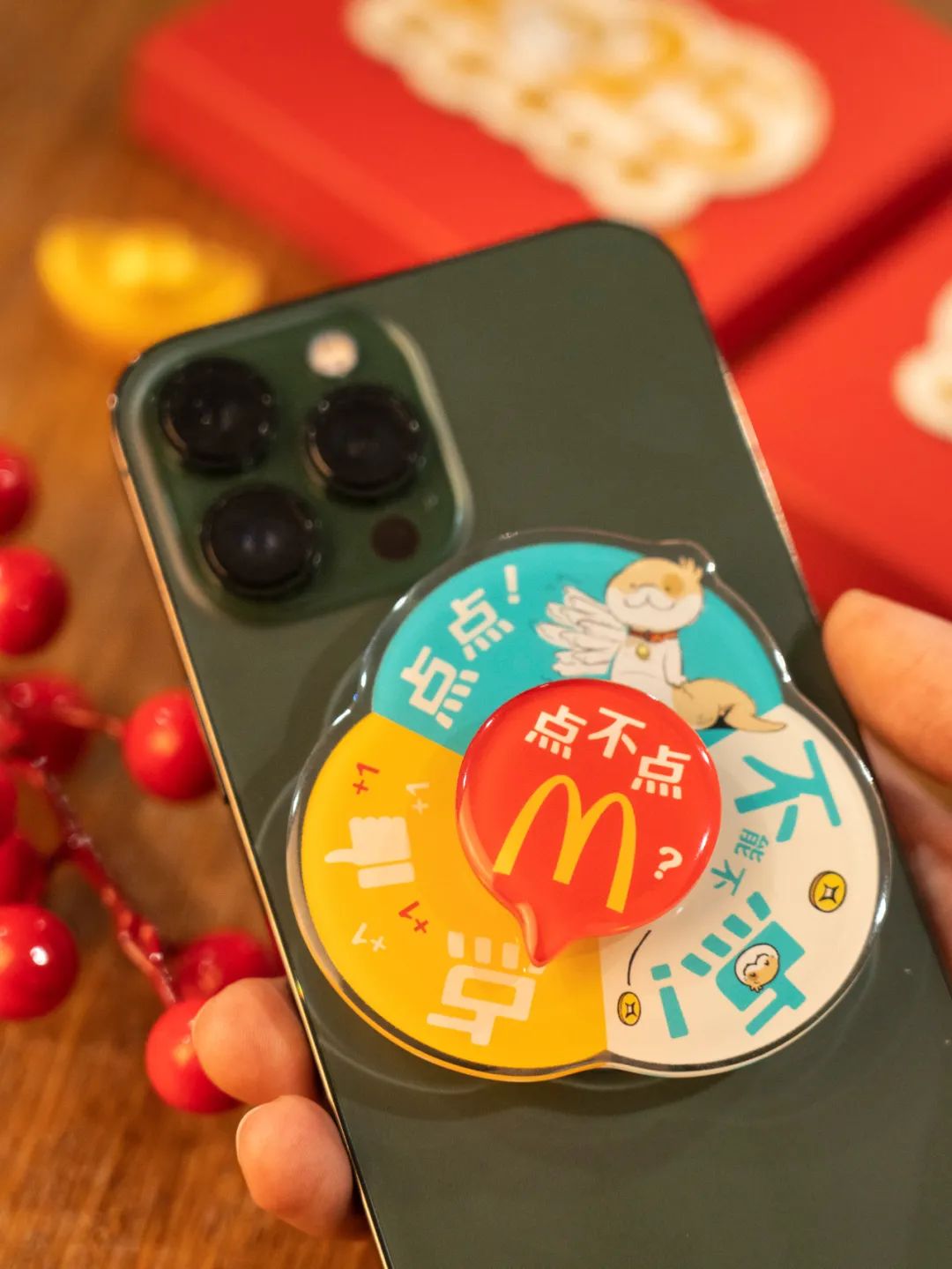 截止目前,麦当劳官方只推出了限定联动周边“点点麦当劳”主题转盘手机支架,只送不卖,可以说吊足了网友的胃口。