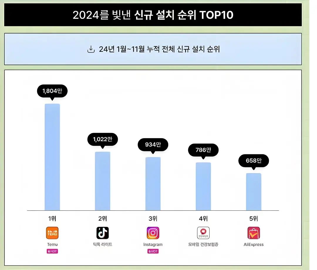 韩国数据服务提供商IGA Works发布的数据显示,截至去年11月,Temu累计新增下载量达1804万次,成为2024年韩国成年人新增下载量最高的应用。抖音海外极速版和全球速卖通分别以1022万次和658万次位居第二和第五。市场前五名中,中国平台占其三。