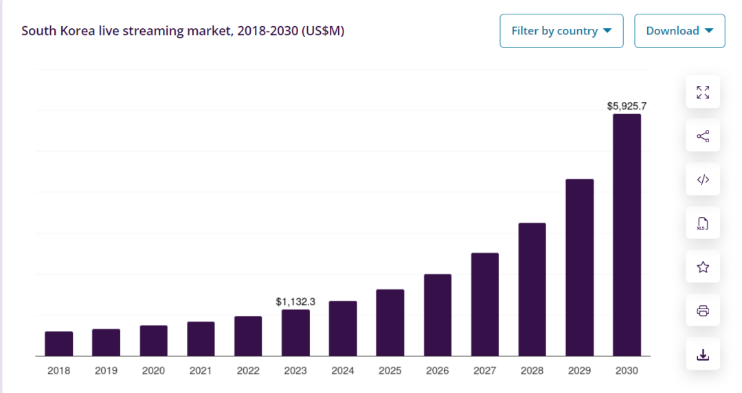 根据Statista的数据,2024年韩国的直播电商渗透率预计将达到53.2%,并在未来五年内进一步攀升至63.7%。