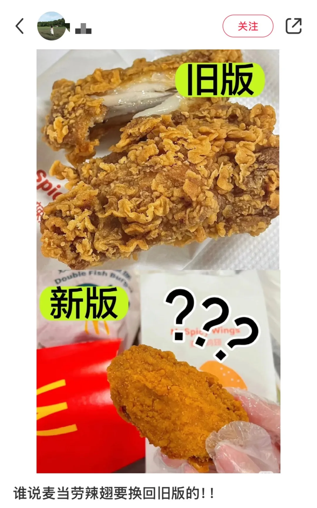 许多消费者认为新版本没有老版本的现场手工裹粉更香更好吃。“没有鳞片”的麦辣鸡翅在社交平台上有一点翻车,许多人因此吐槽金拱门变了心。