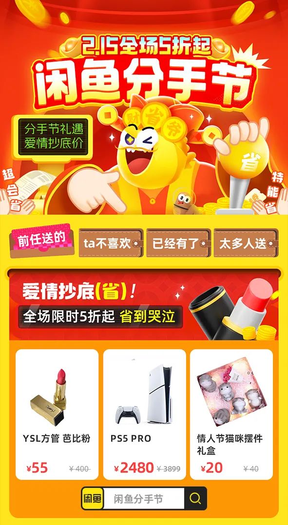 “分手节礼遇,爱情炒底价”,闲鱼“财省爷”让你超会省,特能省。前任送的,ta不喜欢的,已经有了的,太多人送的,统统让你抄底省……离谱但合理。