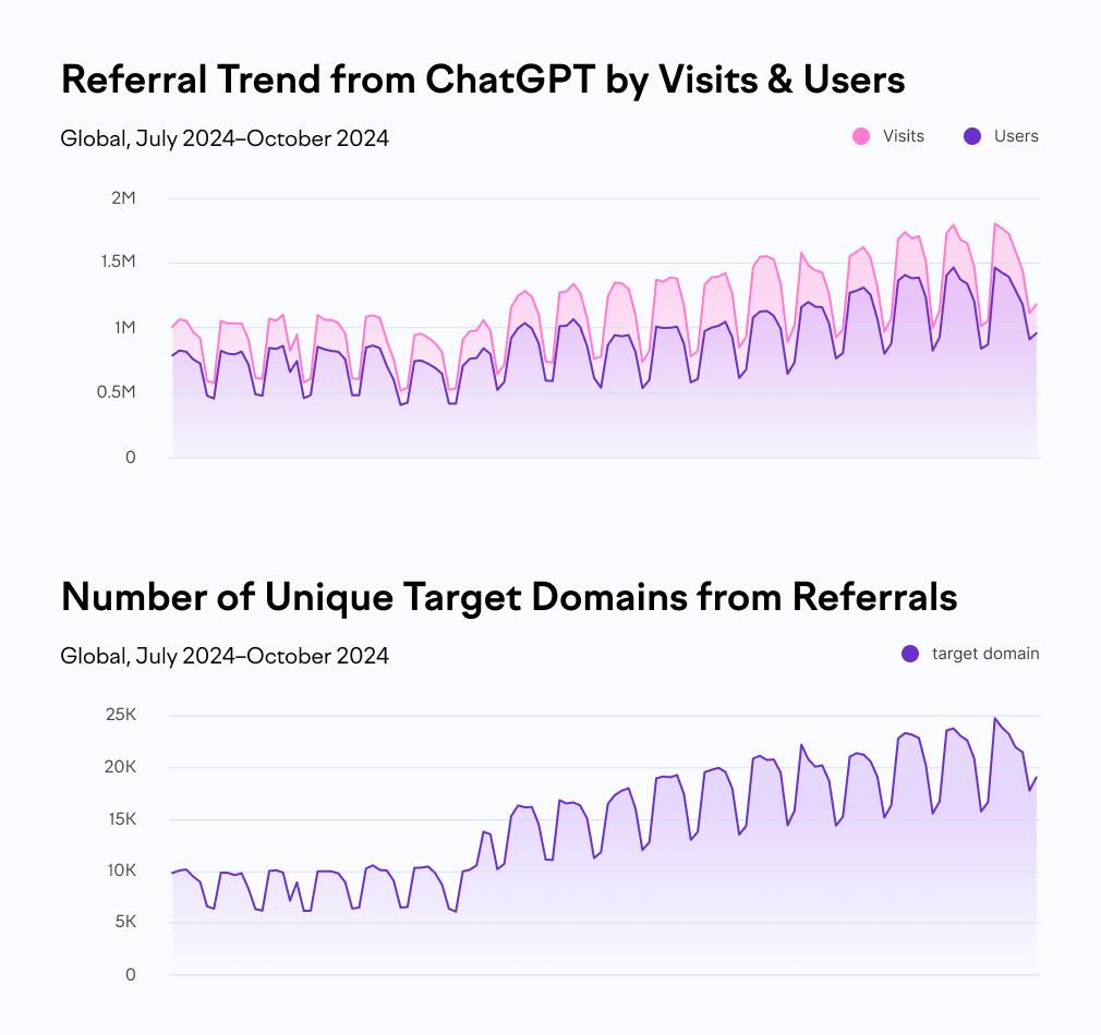 数据显示,仅仅通过ChatGPT联网功能给其他网站带来的流量,三个月增长了60%,每天都有上百万流量从ChatGPT导向外部网站。而从ChatGPT收到流量的独立域名数量,则翻了3倍。[11]