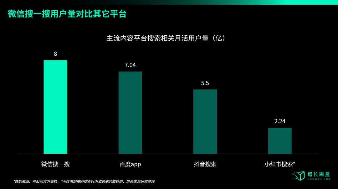 表面上看答案很简单:微信13.82亿MAU体量优势是任何一家公司都不具备的。相对应地,微信搜索功能的月活基本上是中国最多的,甚至超过了百度移动端,这代表了巨大的流量机会,大家都对一座隐藏的矿山充满了遐想。