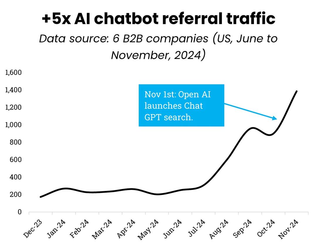 一项针对头部B2B官网流量的研究发现,2024年AI搜索带来的流量竟然增长了500%!按照如此势头建模预测: 三年后,B2B官网的流量将有50%以上来自AI搜索。[8]