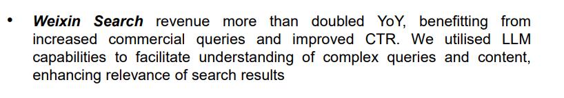 腾讯2024年Q3的财报显示,得益于大模型能力提升了用户体验,微信搜索带来的广告营收同比翻倍增长。