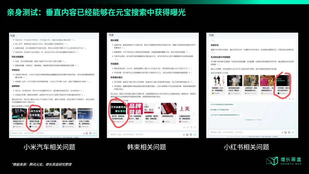 虽然我们还没有拿到微信AI搜索的内测资格,但早就在腾讯出品的“元宝APP”上尝试过搜索功能。结果显示,“增长黑盒”这个公众号的内容,的确能够在某些垂直话题内获得良好的展示,甚至一些主流热门话题也可以(我们并不出名,对吧?)。