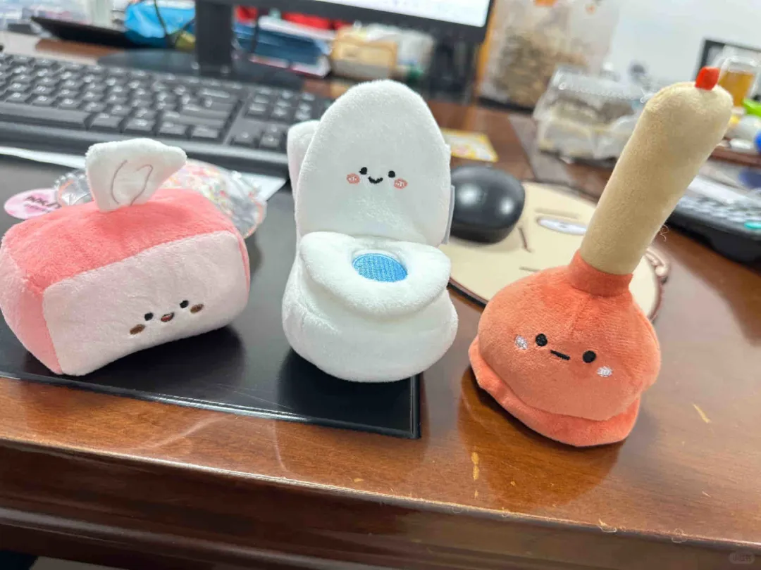 实心的马桶橛子,洁白的小马桶,还有粉粉嫩嫩的厕纸,萌到能让人失去嗅觉。沪上阿姨此次周边设计可以说是迎合了当下年轻人对毛绒玩具的喜好,和对“丑”东西的偏爱之情~