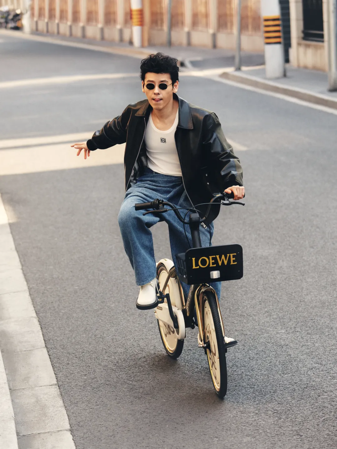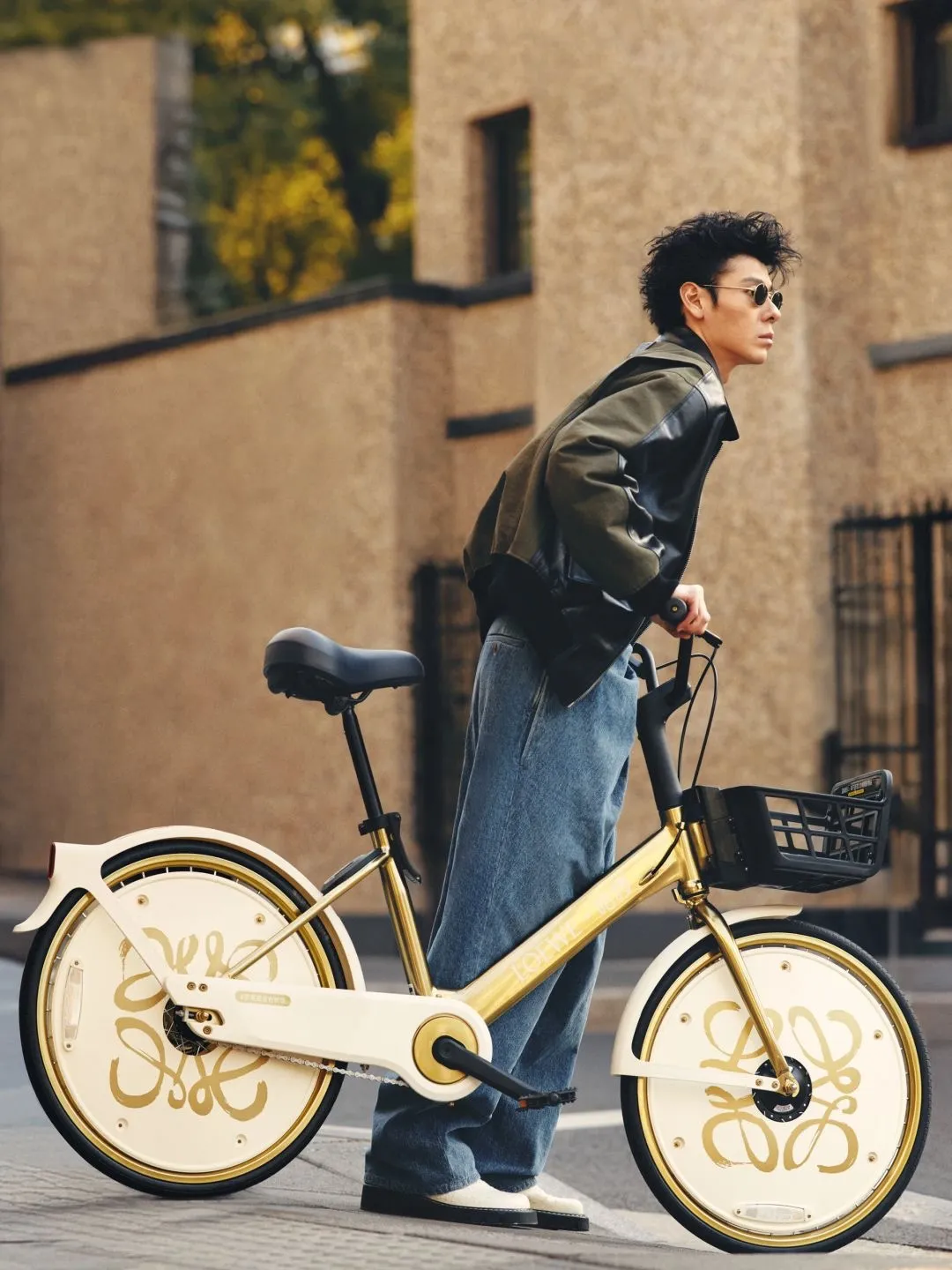 演员蒋奇明率先把金色皮肤的哈啰单车骑上了街,帅气十足。