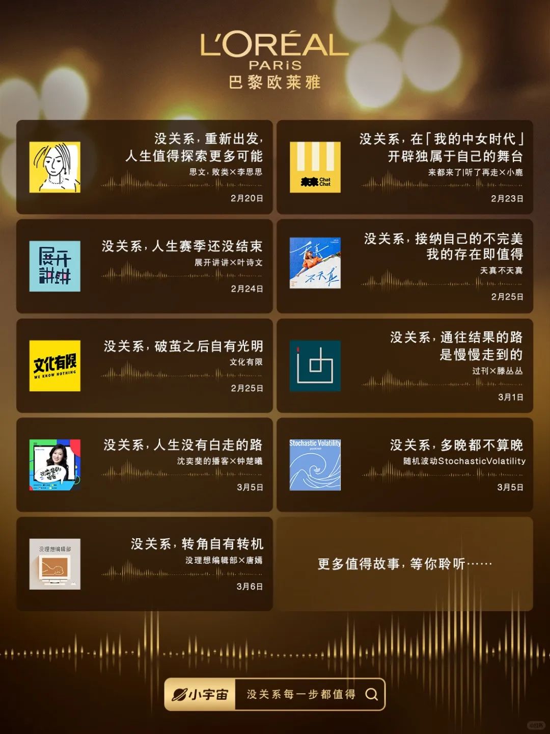 此外,欧莱雅还与小宇宙app合作,推出播客企划《没关系每一步都值得》,邀请各行各业的女性讲述“没关系”的瞬间,传播女性力量。