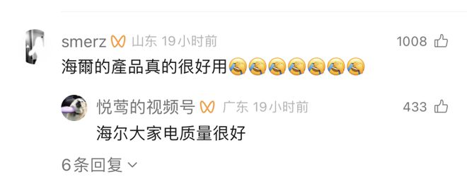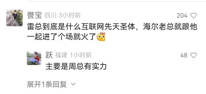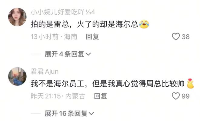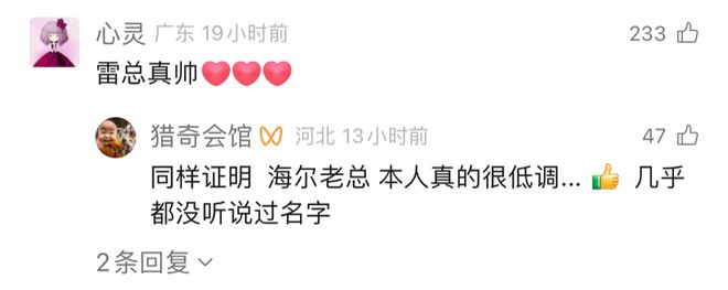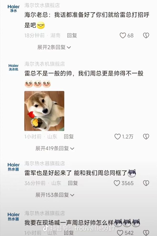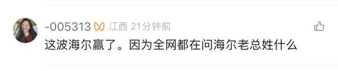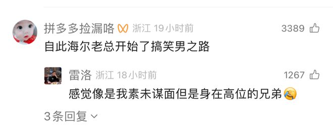 网友1:这波海尔赢了,因为全网都在问海尔老总姓什么 网友2:海尔笑起来好看 网友3:自此海尔老总开启搞笑男之路 网友4:感觉像是我素末谋面但是身在高位的兄弟 ……