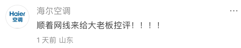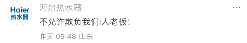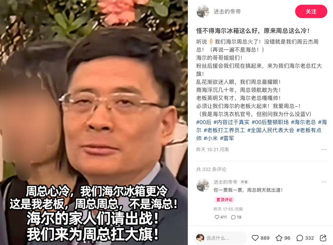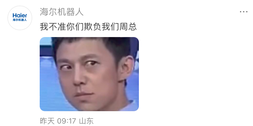 自称海尔洗衣机官号但还没蓝V标志的@进击的帝帝 ,也来为周总扛大旗,上演“我的领导我来宠”的戏码:是周总,不是海总。周总心冷,海尔冰箱更冷!