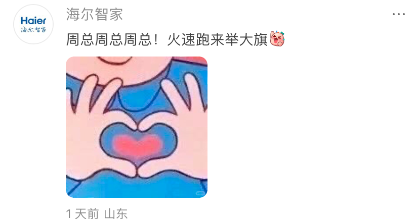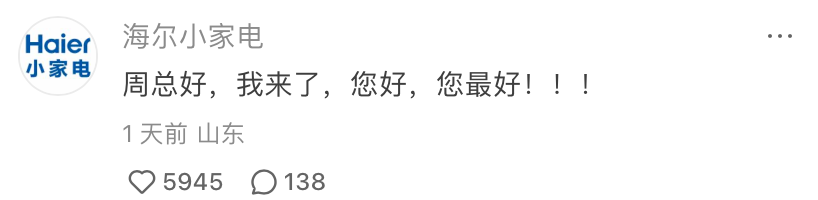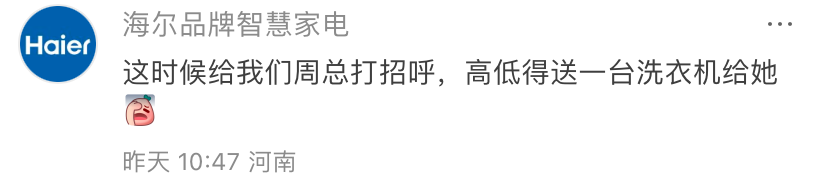 面对这波泼天的流量,目前,海尔官方账号表示,周总即将出道,全网征集账号名称!