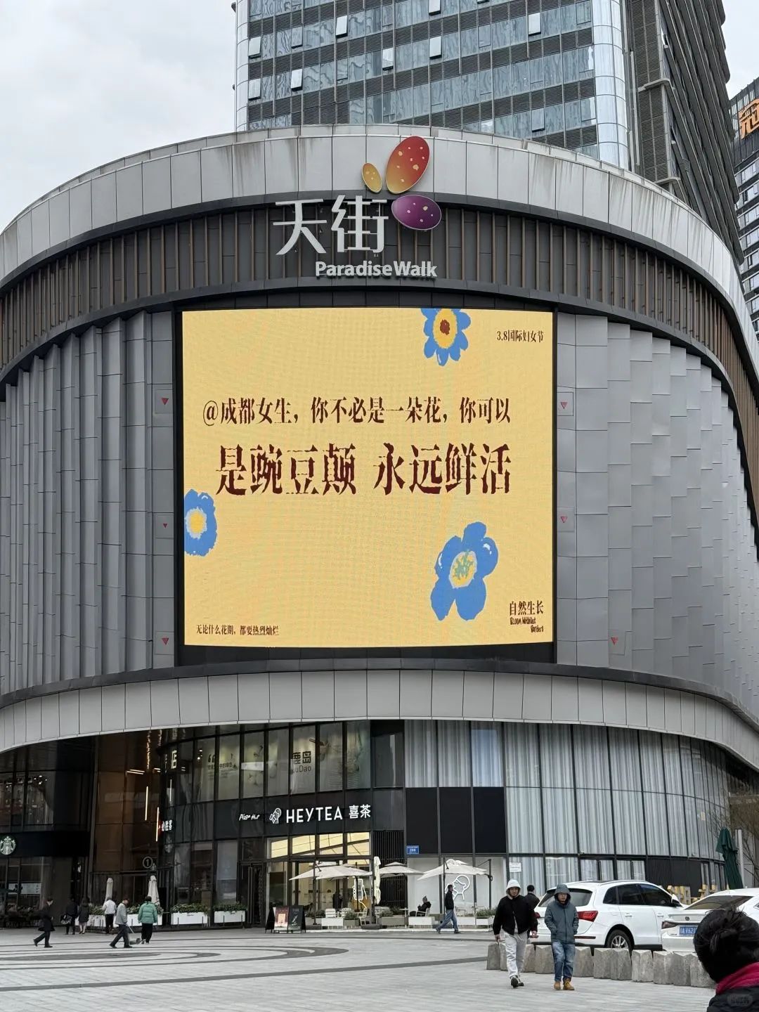 无独有偶,位于成都的滨江天街商场也借户外大屏发布文案海报,来庆祝三八妇女节。
