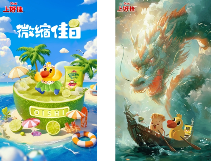 AI赋能+IP二创,升级出圈。灵狐团队通过AI技术赋能内容创作,打造了多元化的优质内容矩阵,涵盖【节日节气主题设计】、【微缩场景构建】、【手机壁纸定制】及【微信推文策划】等,并持续推出"一千零一夜"系列与"像素世界"系列内容。这些创意十足的作品通过对佳族卡通IP形象的故事场景二次创作,巧妙融入上好佳零食产品,实现了品牌IP与产品的深度绑定,每条微博内容阅读量均突破10万+。