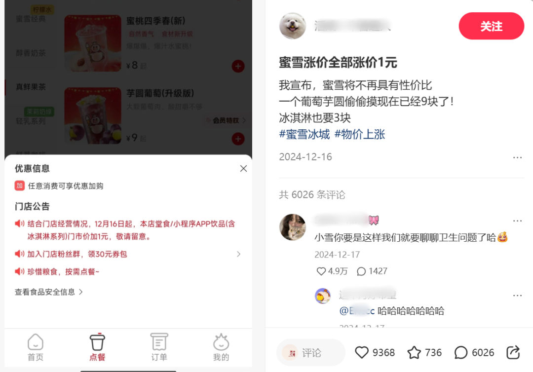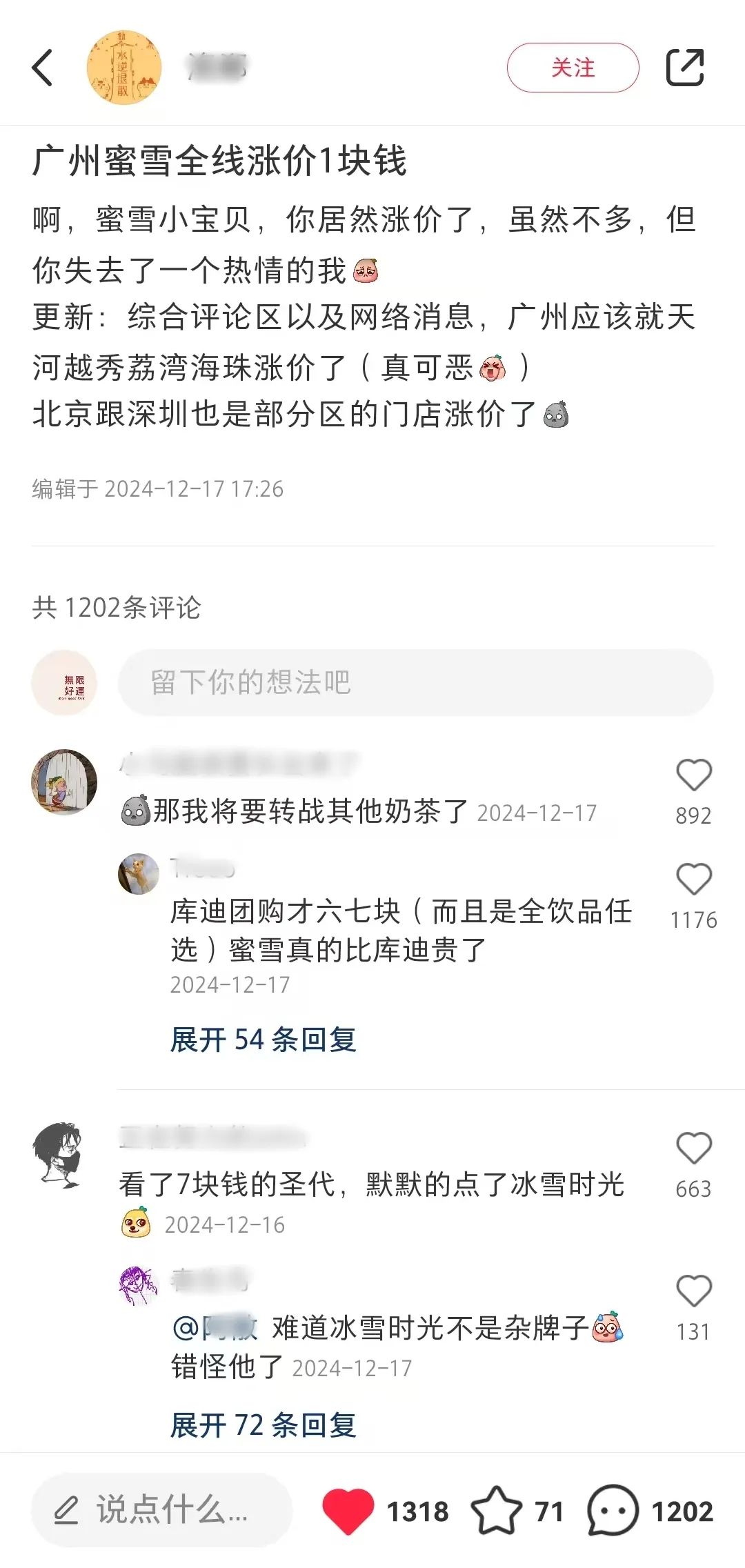 去年底,蜜雪冰城对广州、深圳、北京部分区域门店进行价格调整,部分产品涨价1元。仅仅1元,评论区就引发“雪崩式”讨论:“蜜雪冰城抛弃打工人了吗?”“小雪你要这样我们就聊聊卫生问题了哈”。