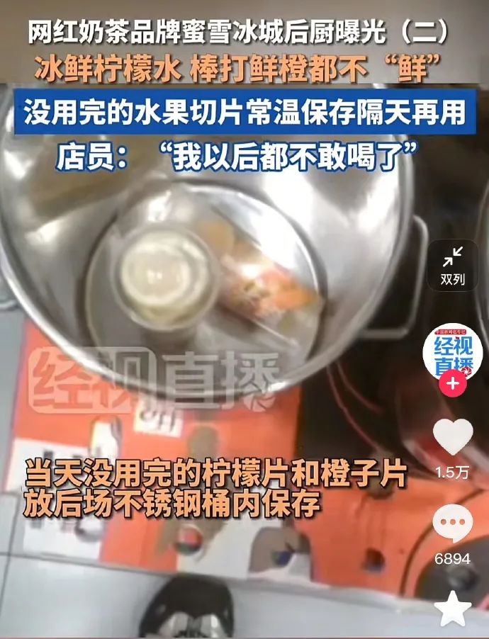 事情是这样的,3月14日,湖北经视“3·15特别报道”曝光了蜜雪冰城宜昌某门店食品安全乱象,记者调查发现,该门店未按规定,使用隔夜柠檬和橙子切片制作招牌饮品,涉事门店被立案调查。
