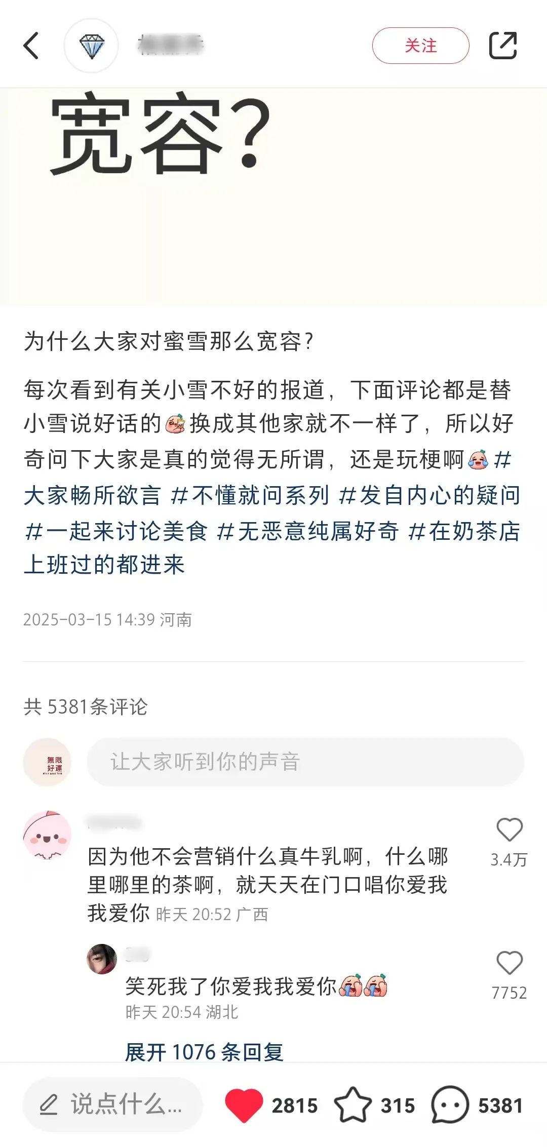 有网友发帖问为什么大家对蜜雪冰城这么宽容?要说雪王这波能全身而退,还得归功于它刻进DNA的土味营销哲学。看完3.4万高赞回复,突然理解为什么雪王要唱“你爱我我爱你”了。