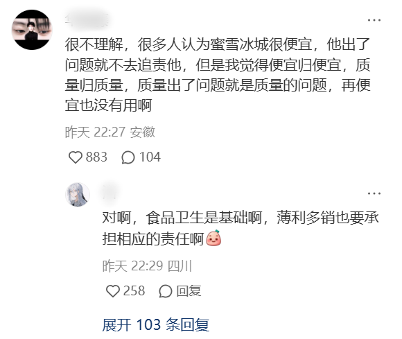 有网友分析因为预期管理做得很好,2块钱的冰淇淋,4块钱的柠檬水,满足的是马斯洛-生理需求,这是它无敌的底层逻辑。再看看市面上二三十的奶茶,还不是照样植脂末兑香精,谁又比谁高贵呢?