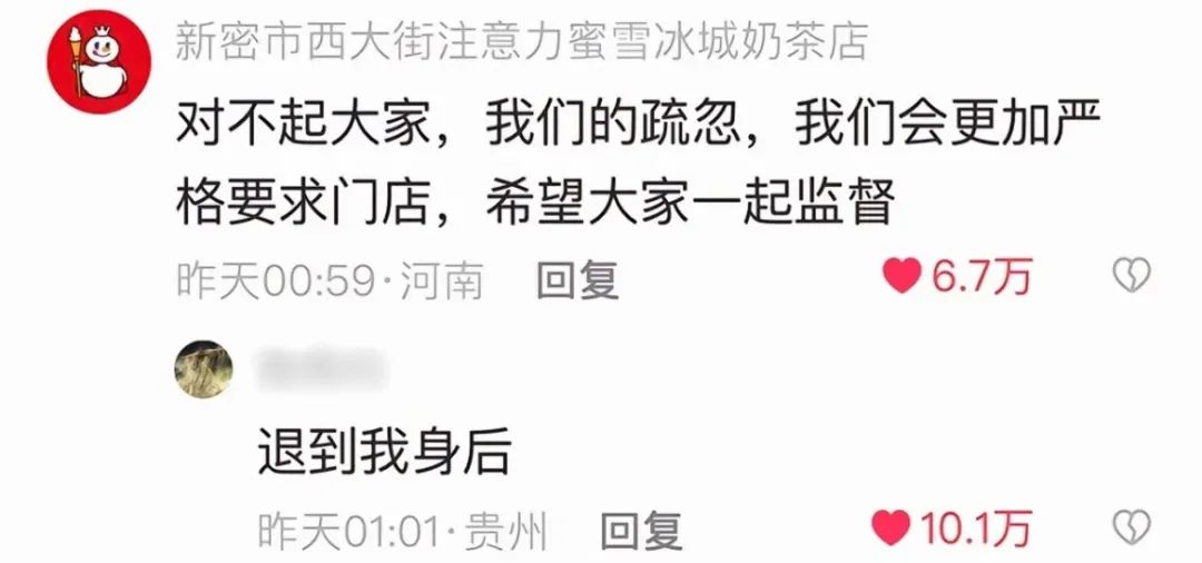 雪王啊你可长点心吧!打工人上一秒“雪门永存”,下一秒就能让你体验“爱豆塌房”的陨落!希望蜜雪冰城珍视大家的这份热爱,别辜负了全网野生公关们帮你圆场的这份心,把产品品控做到位,才能成为让大家放心消费的“国民良心奶茶”。