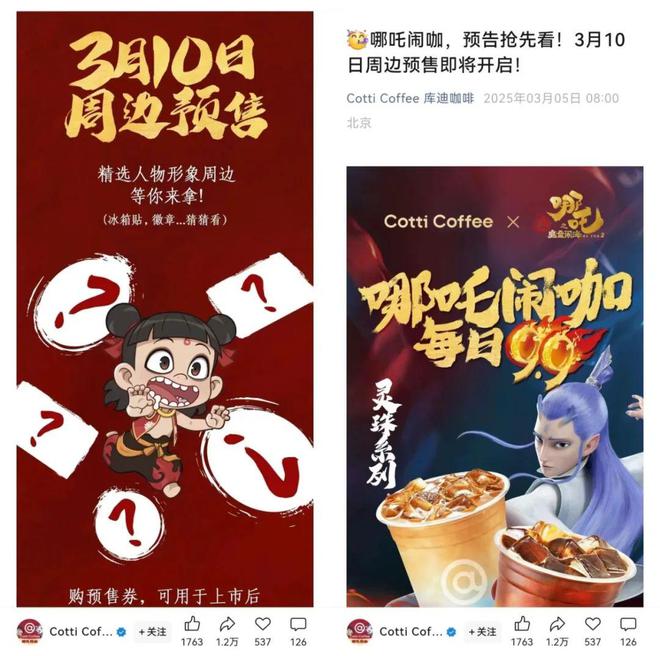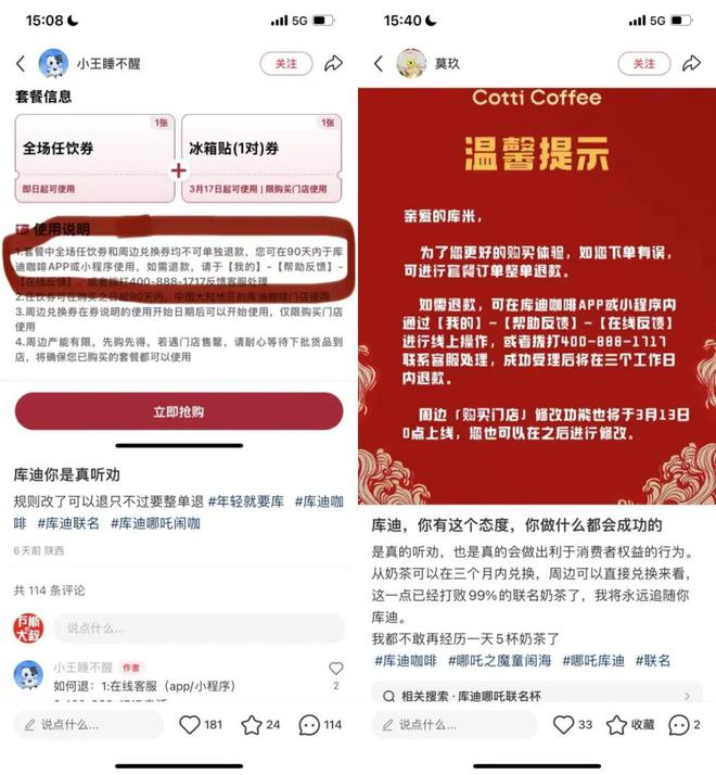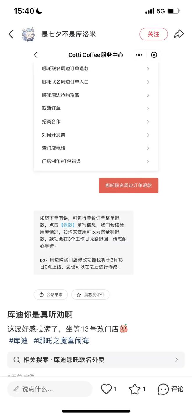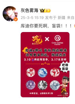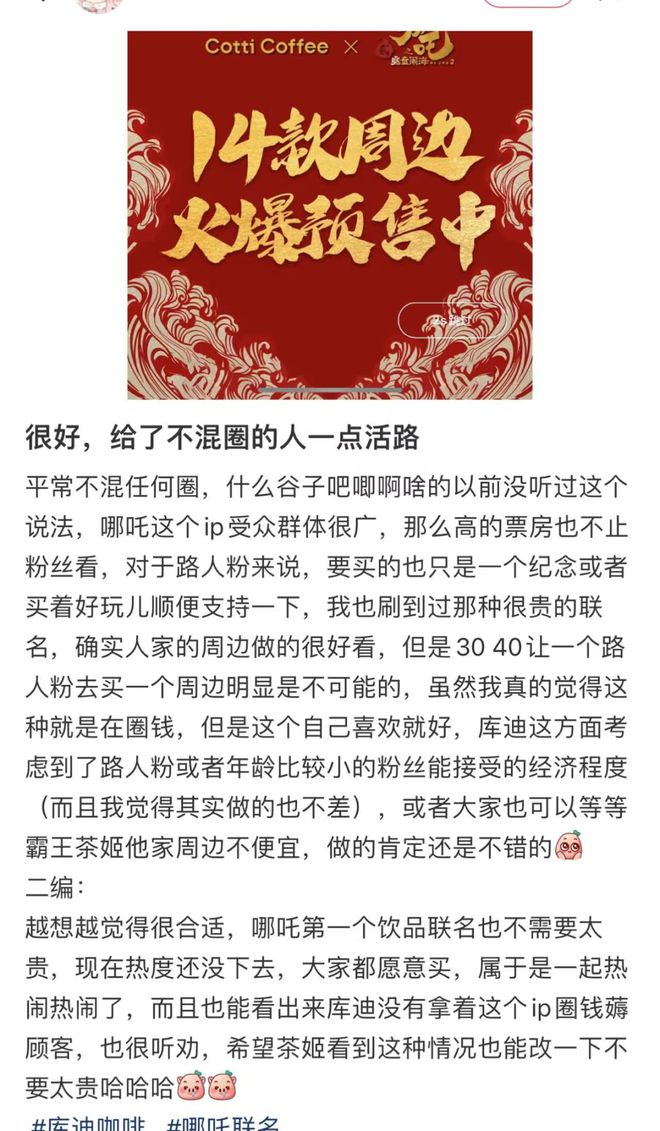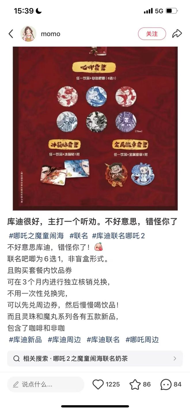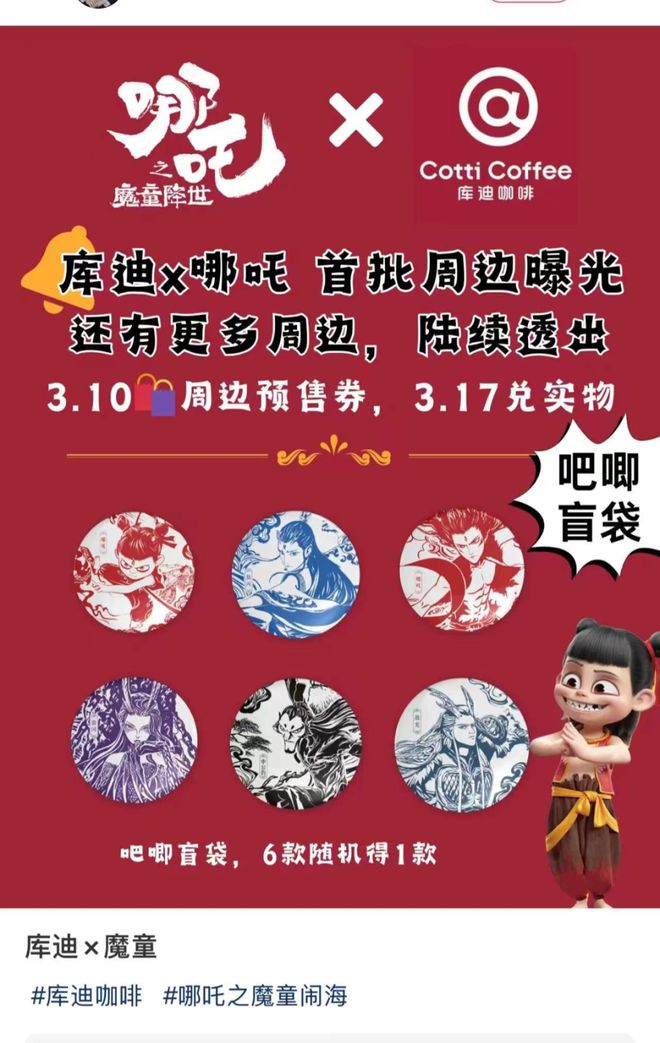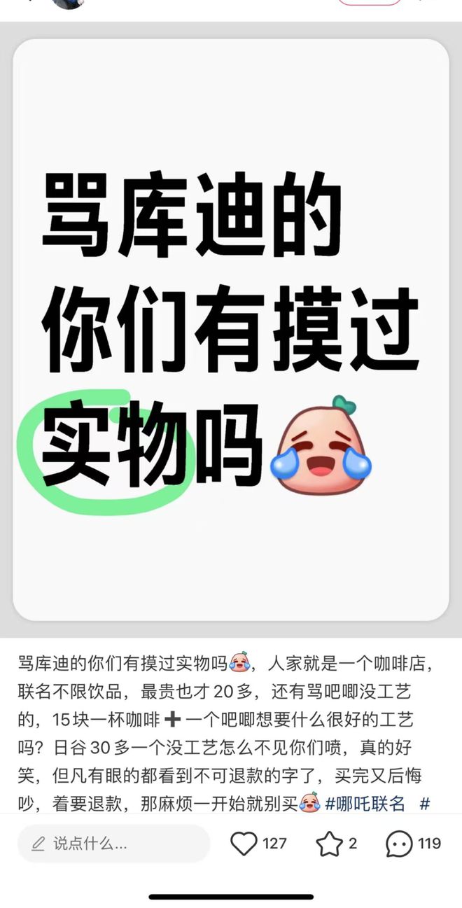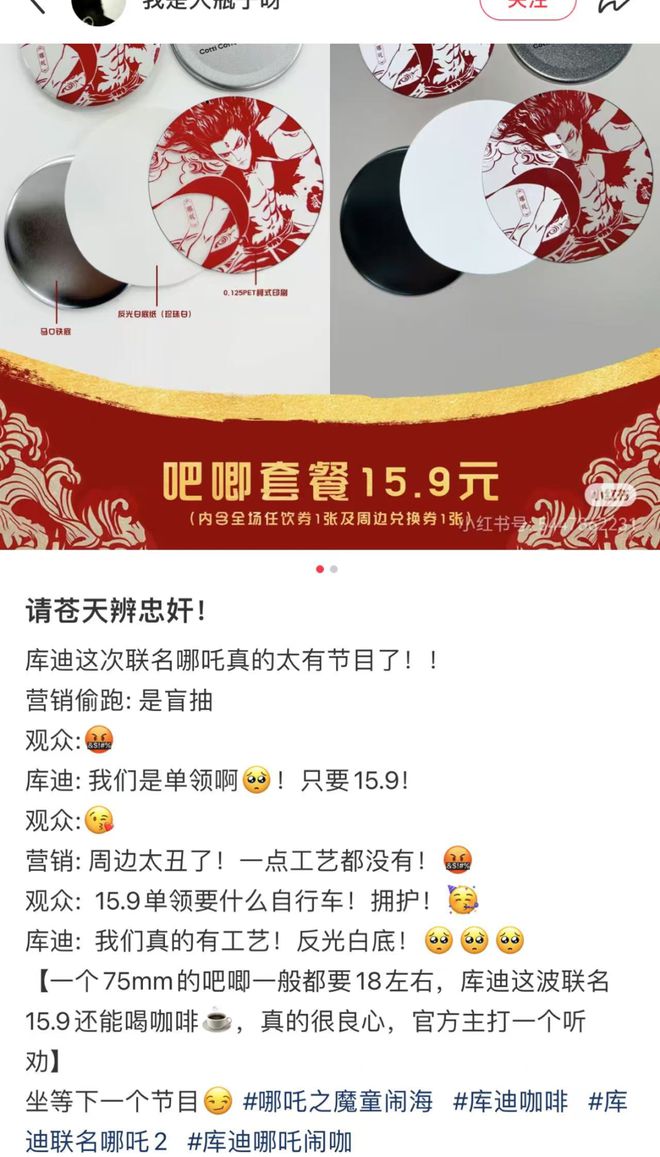 网友5:请苍天辦忠奸!库迪这次联名哪吒真的太有节目了!一个75mm的吧唧一般都要18左右,库迪这波联名15.9还能喝咖啡,真的很良心,官方主打一个听劝!