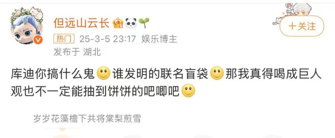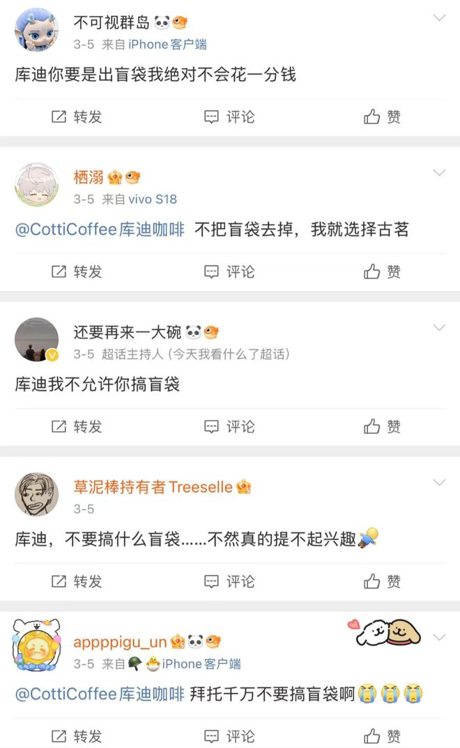网友1:库迪带着你的盲袋滚 网友2:库迪我不允许你搞盲袋 网友3:库迪你搞什么鬼?谁发明的联名盲袋 (那我真得喝成巨人观也不一定能抽到饼饼的吧唧吧 ……