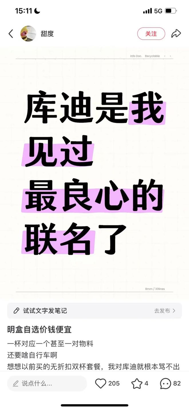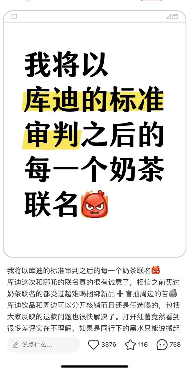“我将以库迪的标准,审判之后的每一个奶茶联名!”某小红书网友。