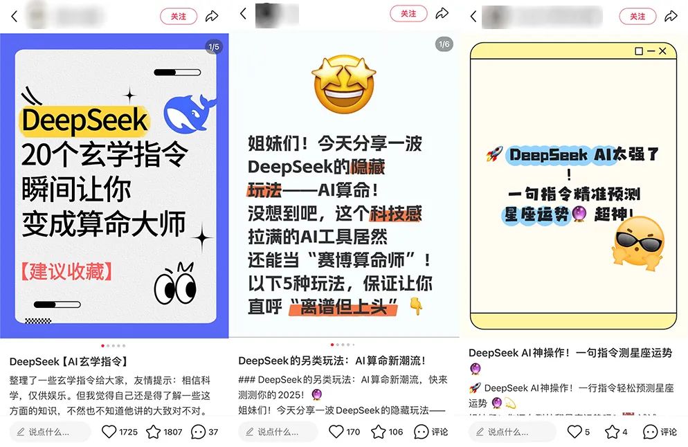 不仅于此,随着Ai的发展,DeepSeek算命、Ai抽取塔罗牌、测算星座运势等很多玄学玩法更是屡见不鲜,给年轻人追求的好运增加了新鲜感与科技感,从禁止蕉绿、工位哪吒、转运咖啡、时来运转手机黄金贴纸等,到现在的Ai算命,也使社交媒体上产生了新玩法——“赛博玄学”。果然,宇宙的尽头是玄学。
