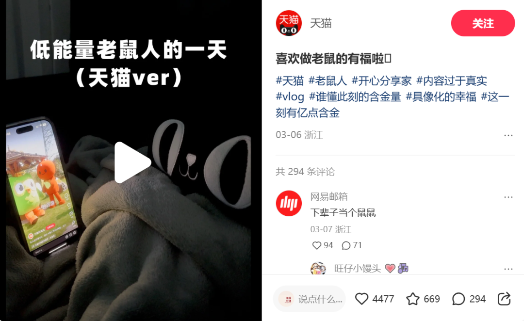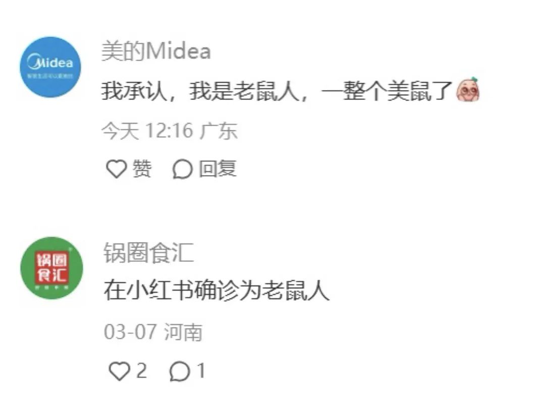 天猫的鼠系作息直接炸出全网同类,美的、锅圈食汇等不少官号下场自动认领“老鼠人”。