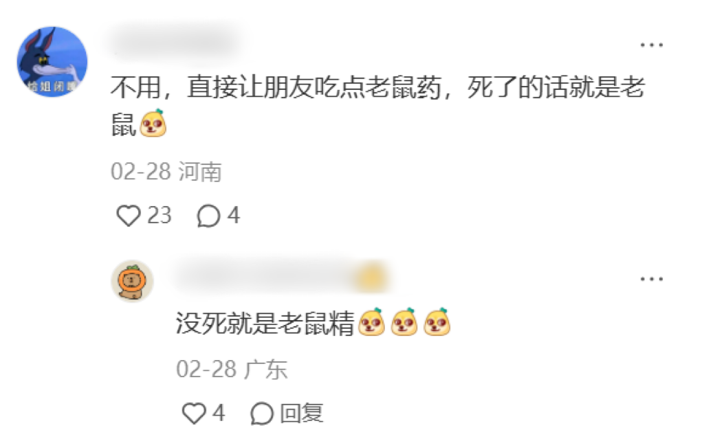 当“赛博灯泡测试法”不管用时,有网友建议还可以直接让朋友吃点老鼠药,死了的话就是老鼠,活着的就是老鼠精。(见过活菩萨,第一次见活阎王)
