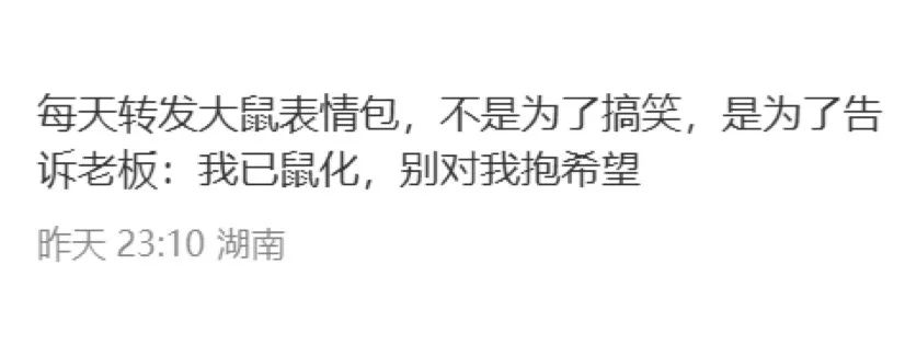 或许,“鼠鼠文学”的真正意义,在于它为我们打开了一扇观察当代青年精神世界的窗口。在这个窗口里,我们看到的不是颓废与放弃,而是年轻人试图在高压社会中寻找喘息之地的努力。
