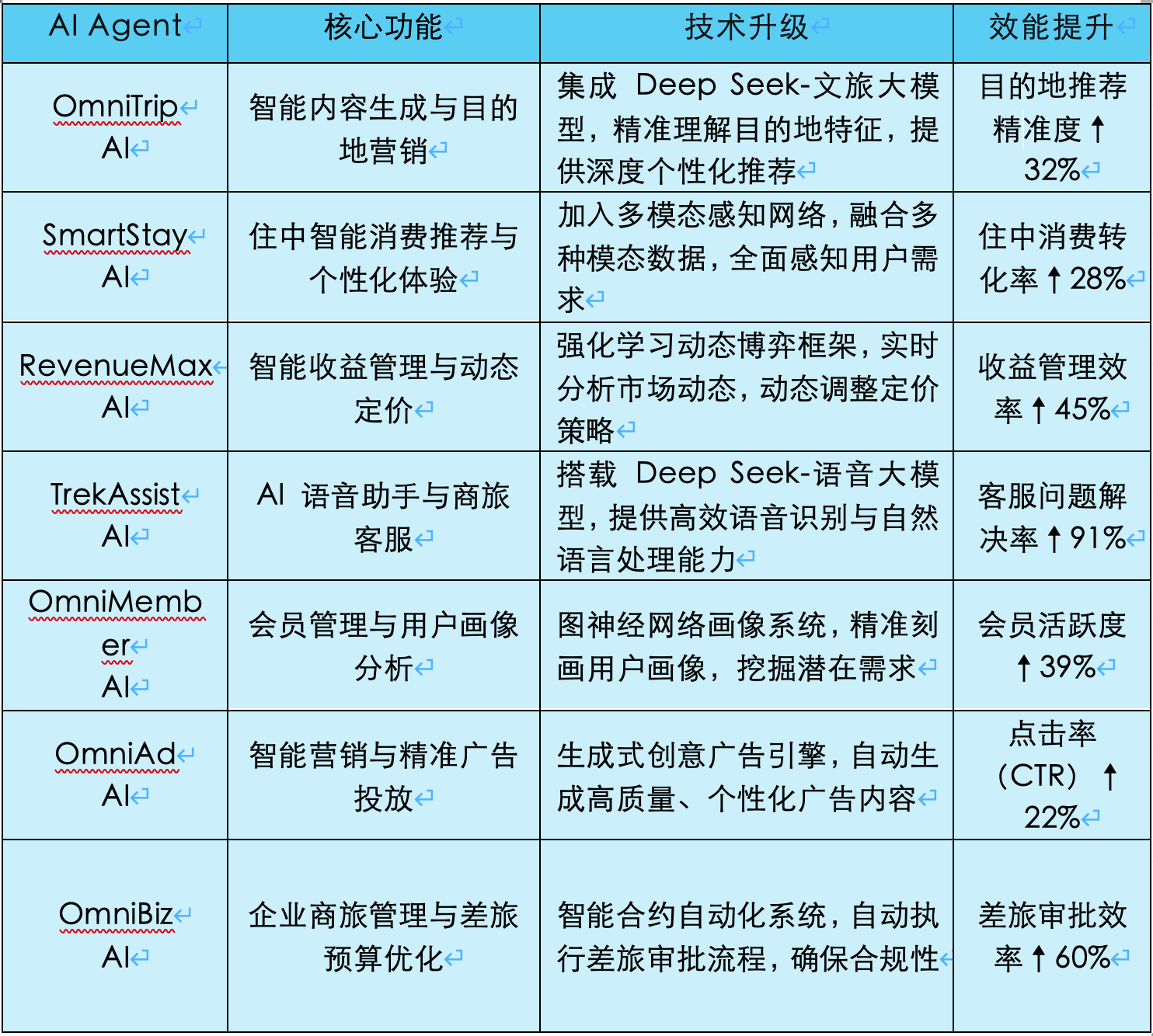 OmniTrek AI 引擎的 7 大 AI Agent专注于智能化推荐、收益优化、个性化体验和智能营销,通过 OmniTrek AI 引擎为商旅产业提供跨行业、跨场景的智能化赋能,助力企业在全球商旅市场中脱颖而出,开启智能化发展的全新篇章。