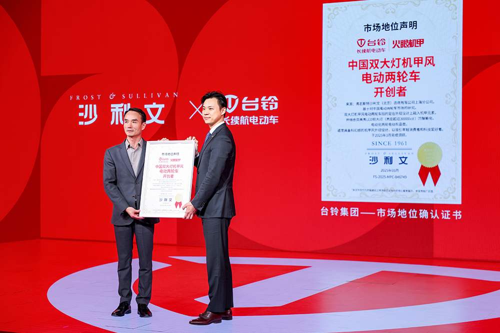 发布会上,全球增长咨询公司弗若斯特沙利文为台铃颁发了“中国双大灯机甲风两轮电动车开创者”认证书。沙利文大中华区合伙人兼董事总经理杨晓骋在发言时说道:“当下行业仿冒乱象依然存在,我们呼吁广大企业坚持原创,像台铃一样持续探索产品造型与技术方面的创新。”