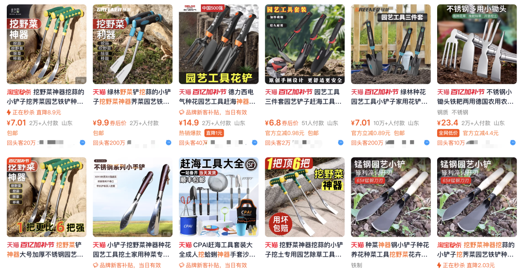 社交媒体讨论的热度以及网络的搜索量,影响着众多消费者的消费行为,与挖野菜相关的工具市场迎来了新的需求,小剪刀、菜筐子等原本小众的商品,销量开始显著增长。天猫平台的数据就给出了佐证,“挖野菜神器”关键词的搜索量实现了58%的增长,便携铲、小型铲类相关产品销售量增长了80%,部分单品月流水近10万。