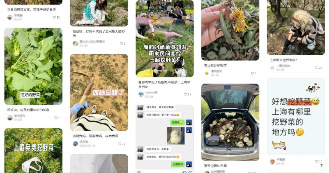 谁能想到,曾经被视作“老年人专属”的挖野菜,如今成了都市青年的新宠。打开小红书搜索“挖野菜”,满屏都是年轻人晒出的“战利品”,有人驱车两小时就为找一片野菜地,有人对着手机教程现学现挖,有人把挖来的野菜做成精致料理。还有人把挖野菜拍成vlog,配文写着“今日打野战绩”,把田间地头玩成了游戏副本。