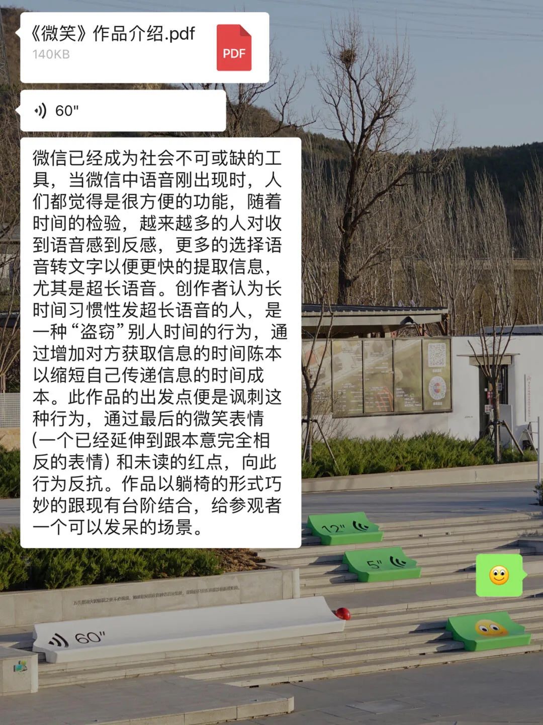 最近北京门头沟檀谷公园里,一组会"说话"的景观座椅火了!刺眼的60秒未读语音进度条,这哪是长凳,分明是甲方爸爸的语音轰炸现场!