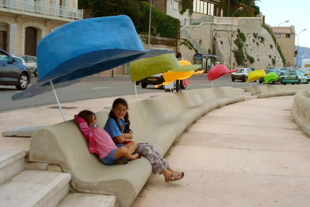 自带遮阳帽的城市公共座椅,下雨天也可能会变成水帘洞。